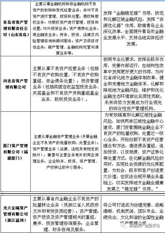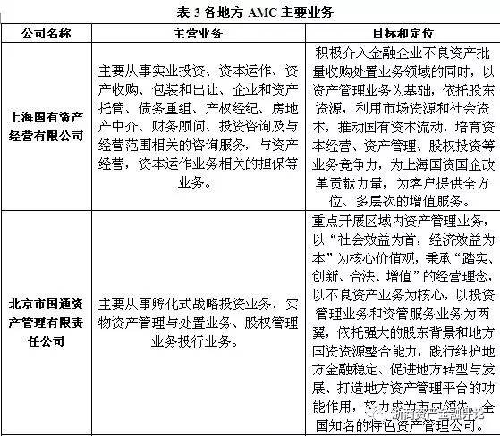 資產管理公司對不良資產的處置需要運用到多種手段,因此,開展相關業務輔佐不良資產的處置就顯得尤為重要。但由于各地方AMC的定位不同,其所開展的主要業務也有所差異,例如有些地方AMC將自身定位為地方不良資產的“收集器”,因此主要以收購不良資產業務為主;而有些地方AMC則側重于解決地方政府和國有企業的不良資產問題,在開展不良資產業務的同時還開展結構化業務;還有部分地方AMC以市場化的資金業務為主,將自身打造為地方綜合金融服務平臺。具體如下表所示: