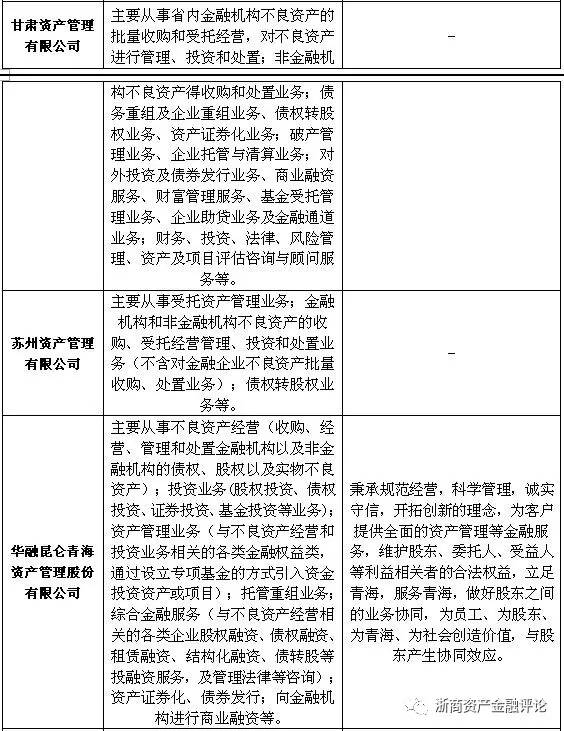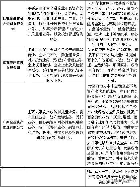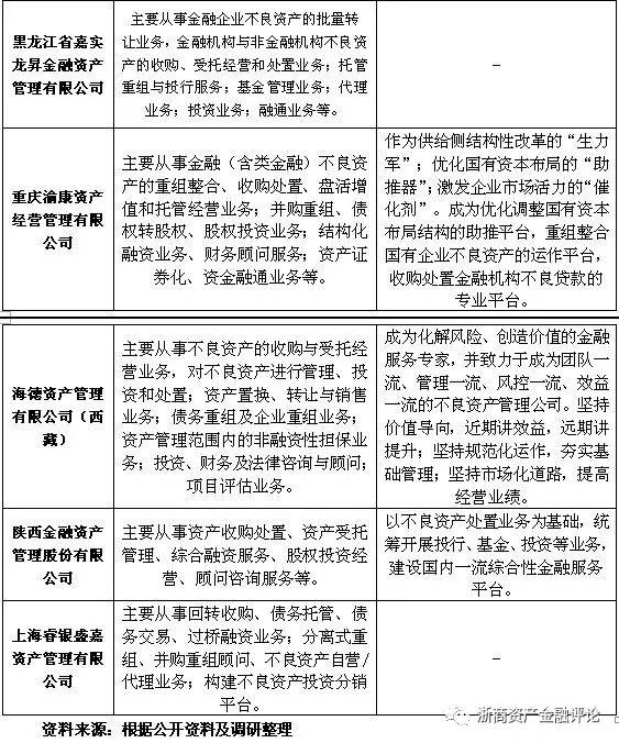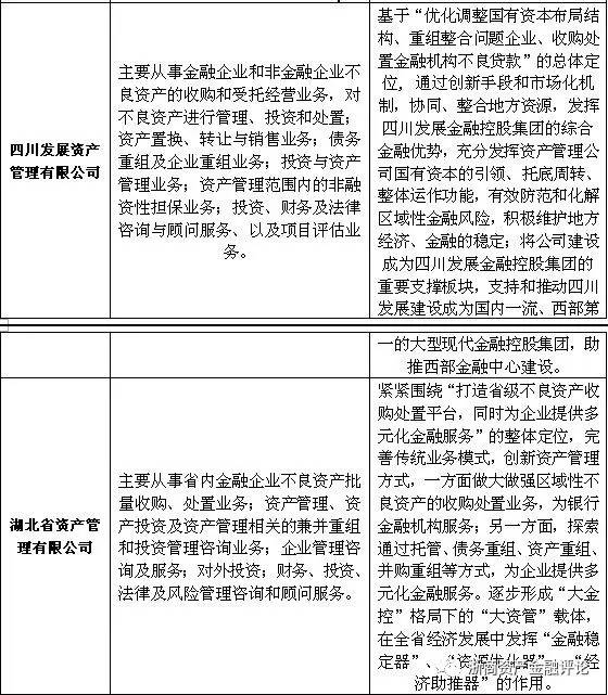 值得注意的是,除去主流的不良資產處置業務、資產管理業務、投資與咨詢等方面的業務外。部分資產管理公司另辟蹊徑,開展了一些較為獨特的業務。具體來看,較為特殊的有上海國有資產經營有限公司的不動產投資業務、重慶渝富資產經營管理集團有限公司的土地經營和城市建設業務以及福建省閩投資產管理有限公司的對金融、基礎設施、高新技術產業、工業、制造業、服務業的投資與管理業務等等。上述業務的開展,很大程度上與地區的行業優勢或地方政府的相關規劃和發展需要相關。