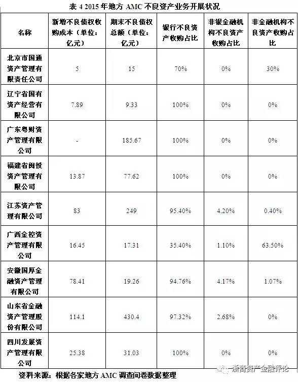 由上表分析可以發現,地方AMC的經營策略雖各不相同,但大致可以分為以下三類:一是走專業化的資產管理道路,在不良資產處置業務的基礎上,開展投資融資業務,基金管理業務和投行業務等,提升資產管理業務的綜合實力。以浙江省浙商資產管理有限公司為例,浙商資產依托其核心的不良資產處置與經營業務的專業能力,開展了托管、清算和重組業務,并憑借政府和社會力量的支持,設立地方基金,為當地企業提供資金支持。二是根據區域潛在需求,打造地方專屬業務。以重慶渝富資產經營管理集團有限公司為例,由于重慶海綿城市建設項目和主城區內污染企業搬遷的進行,渝富集團相應的開展了土地經營業務和城市建設業務,主要負責重慶主城污染搬遷企業、破產關停企業、退二進三企業土地收儲工作和土地開發、基礎設施建設及相關產業投資等。土地經營業務和城市建設業務的開展形成了一定的協同效應,將破產重組、不良資產處置、土地收購、土地開發與投資、基礎設施建設等串聯了起來,形成了一條完整的業務鏈條,在提升各業務運營效率的同時,提高了業務收益水平,滿足了地方城市建設的需要。除此之外,山東金融資產管理股份有限公司對當地農信社的不良資產進行整體收購處置也是極具代表性的例子之一--農信社是山東省營業網點和從業人員最多、服務范圍最廣、資金規模最大的金融機構,為配合將農信社改制為農村商業銀行,激發發展活力,山東金融資產管理股份有限公司對農信社的不良資產展開了收購,并形成了一套以信托方式解決的可行方案,助力當地農信社改革。三是打造區域金融平臺,借助平臺優勢開展多元化業務結構,并進行一定的金融創新。還是以浙江省浙商資產管理有限公司為例,浙商資產依靠自身業務平臺和與當地政府和金融機構的聯系,為企業提供多樣化的服務,如供應鏈金融服務、財務管理和戰略咨詢業務;同時還運用金融創新工具,對企業開展不良資產遠期收購業務和互聯網金融服務等等。