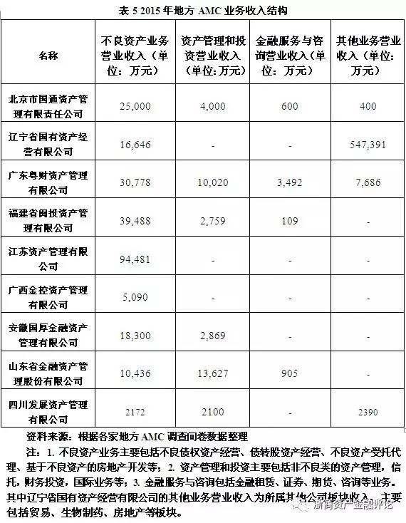 可以看到各地方AMC開展的業務種類繁多,除去最基本的不良資產處置業務外,多數地方AMC還選擇開設相關法律咨詢業務以及投資融資等業務。一方面,這是出于支撐不良資產處置業務的考慮;另一方面,開展其他金融服務業務能為自身帶來較高的收益。由于地方AMC所獲得的不良資產質量相對較差,且處置方式受到較大的限制,導致不良資產業務收益不高(相對于四大AMC而言)。因此,多元化業務結構,滿足市場的潛在需求,從其他業務層面尋找利潤增長點成為了許多地方AMC的選擇。