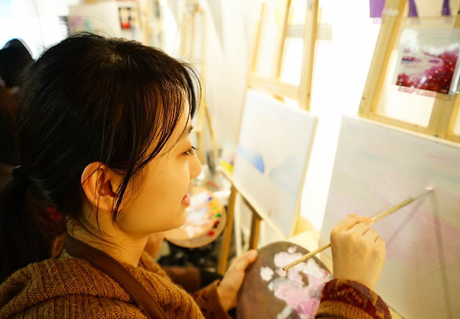 用圖畫裝飾生活,用畫筆記錄美好。盡管公司大部分女員工都并沒有太多的繪畫基礎,在作畫的過程中,許多人都碰上了困難,或者調不出理想的顏色,或者拿捏不準間架結構。但通過畫室老師的指導,以及同事之間的互相幫助,最終完成了一幅幅令人驚嘆的畫作。財務部周潔漪的星空圖奇幻燦爛、運營部徐苒子的櫻花樹夢幻美好、人力資源部總經理錢煒的向日葵生機勃勃,每一個人都在自己的筆下創造了美好與奇跡。