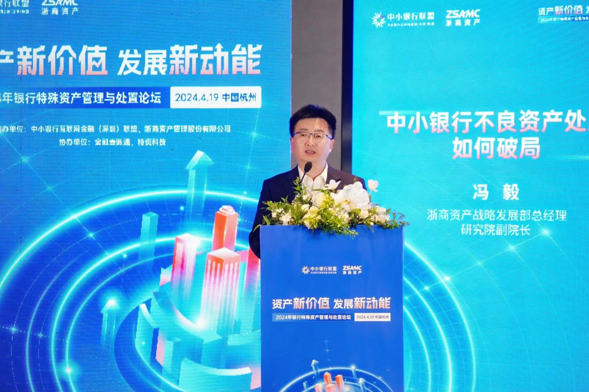 省國貿集團黨委委員、浙商資產黨委書記、董事長應春曉,中小銀行聯盟執行副理事長、金融壹賬通黨委書記、監事長黃潤中為論壇致開幕詞,浙商資產戰略發展部總經理、研究院副院長馮毅作為嘉賓之一進行主題演講。