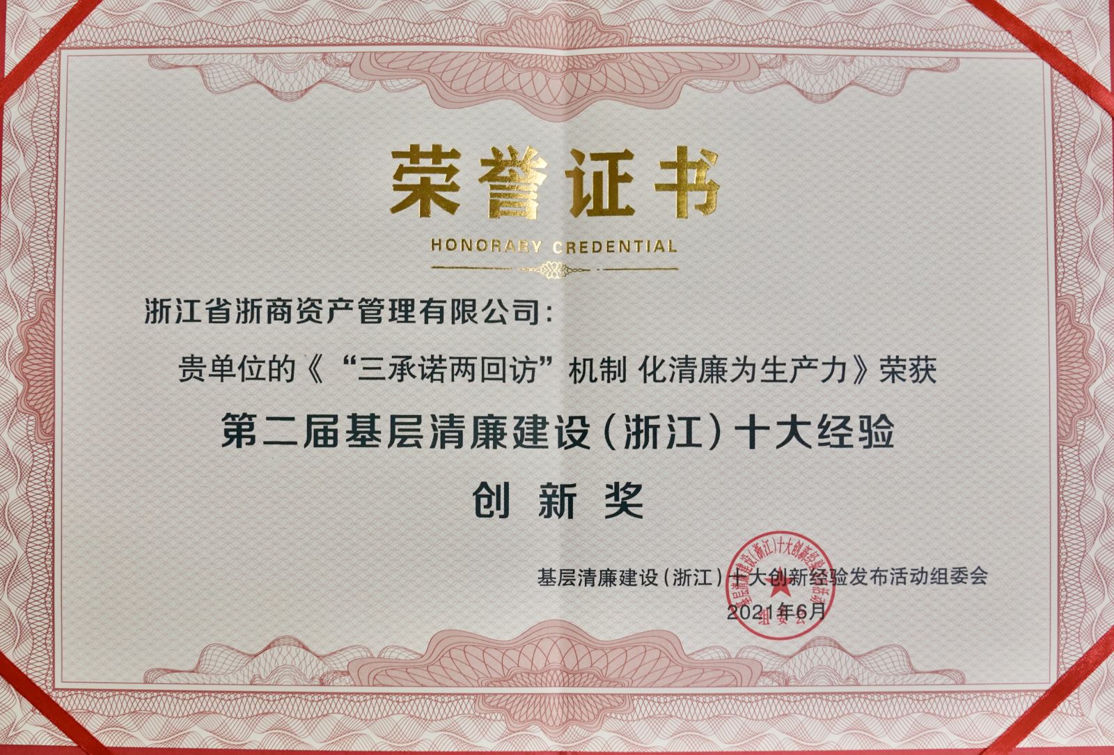 6月18日,由省紀委省監(jiān)委指導,浙江日報報業(yè)集團、浙江大學主辦,《反腐敗導刊》雜志社、浙江大學廉政研究中心承辦的第二屆“基層清廉建設(shè)(浙江)十大經(jīng)驗”發(fā)布活動在杭州隆重舉行,浙商資產(chǎn)《“三承諾兩回訪”機制 化清廉為生產(chǎn)力》榮獲“創(chuàng)新獎”。